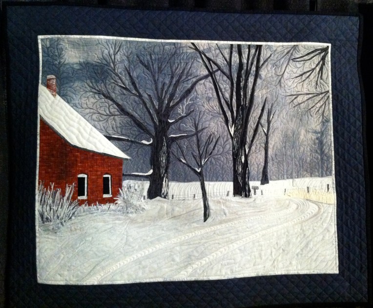 “The Laneway” by Grace Whiting from the O Canada exhibit. Techniques: Some machine piecing and quilting; hand appliquéd. Delicate threads create the foliage while the quilting pattern echoes the undulations of the fallen snow.