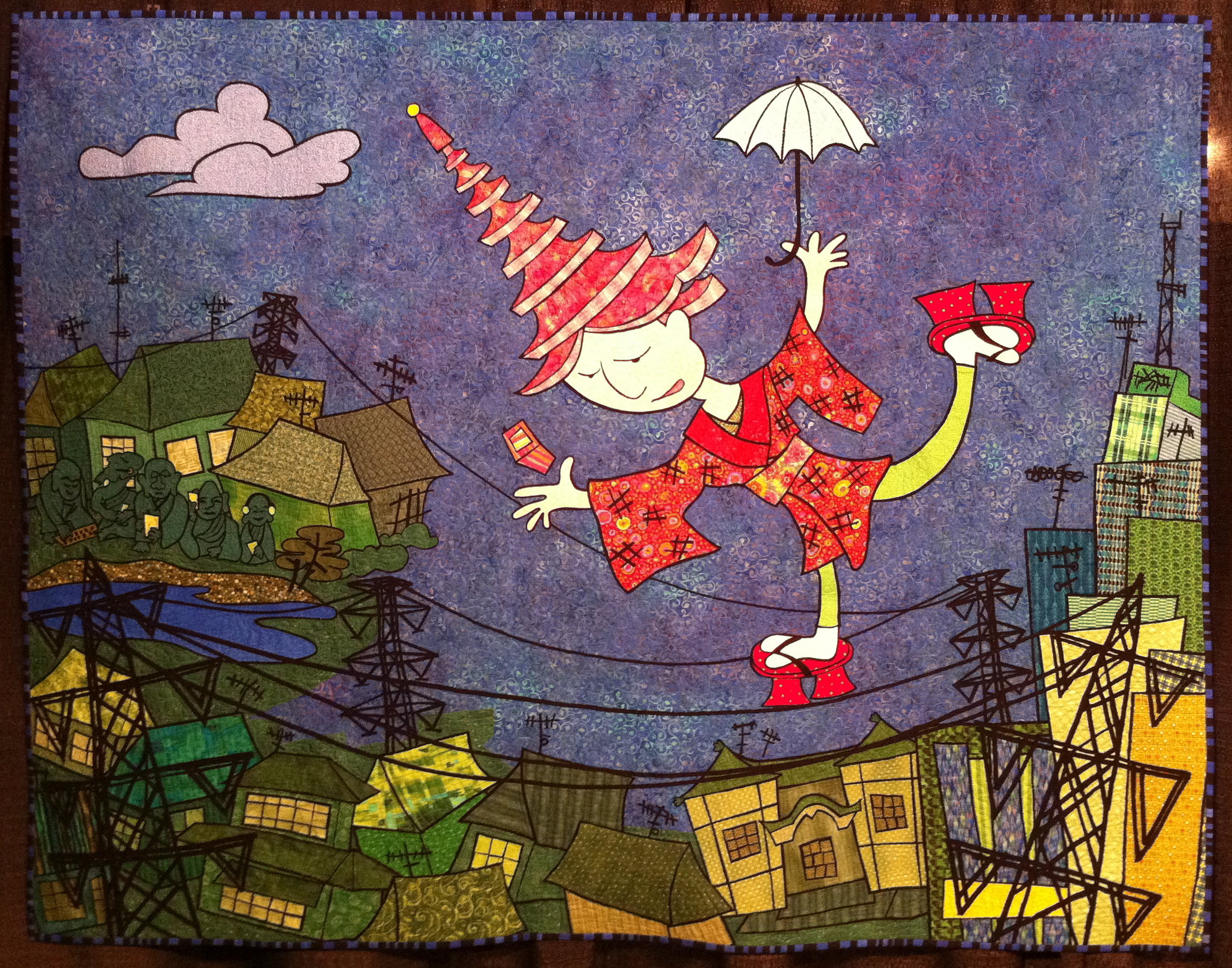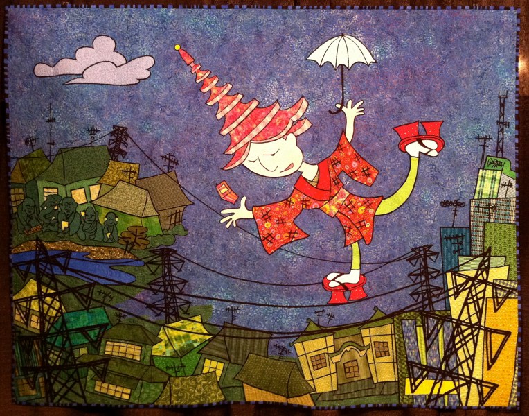 From the Art-Whimsical category, “Tokyo – Wish You Were Hair” by Pam RuBert. The artist made the quilt for an exhibition “exploring the intersection of fiber art with new technologies.”