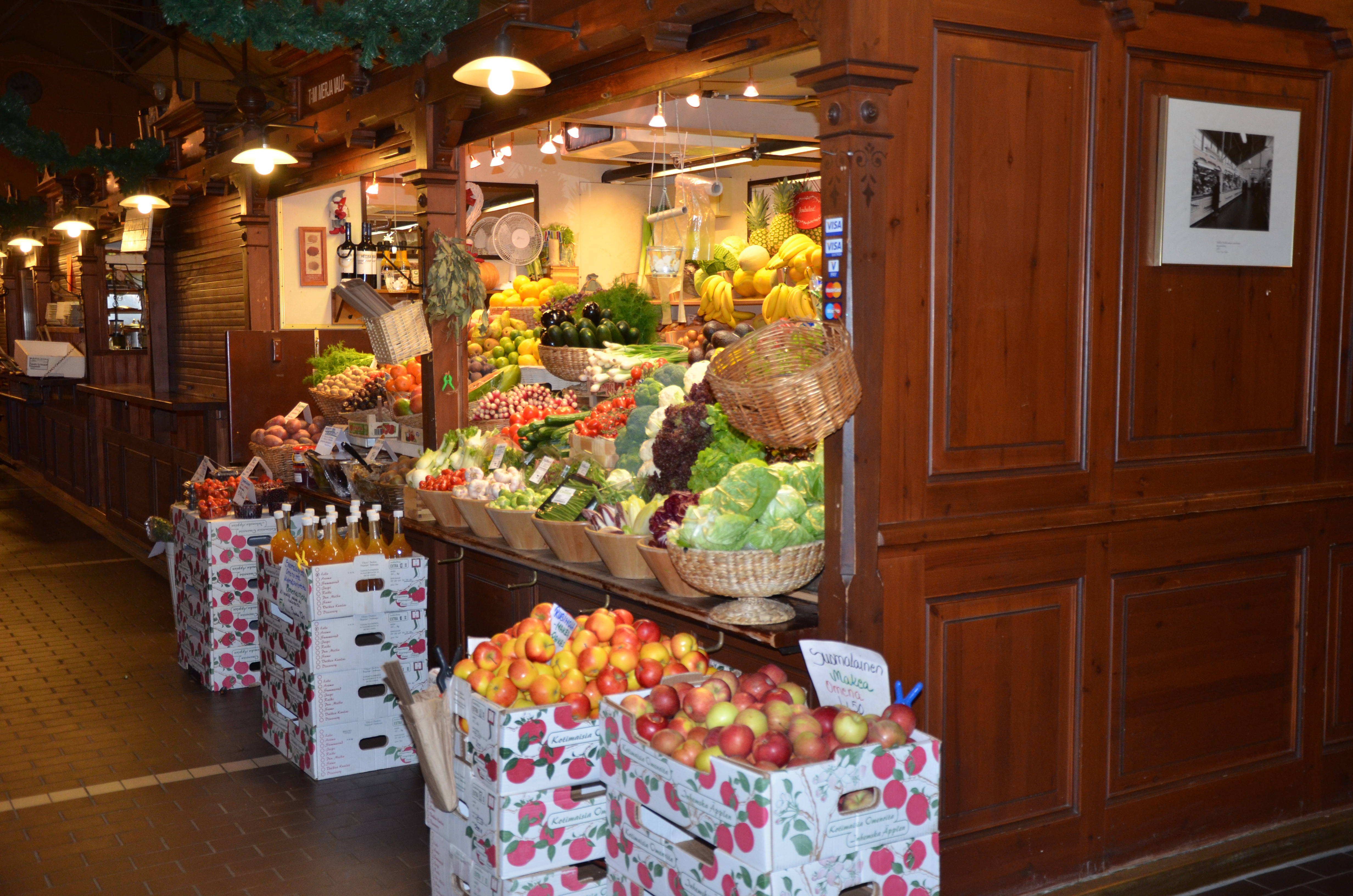 Fruits and veggies inside the old market hall. You could also find fresh salmon steaks, herring and reindeer at the fresh meat stalls.