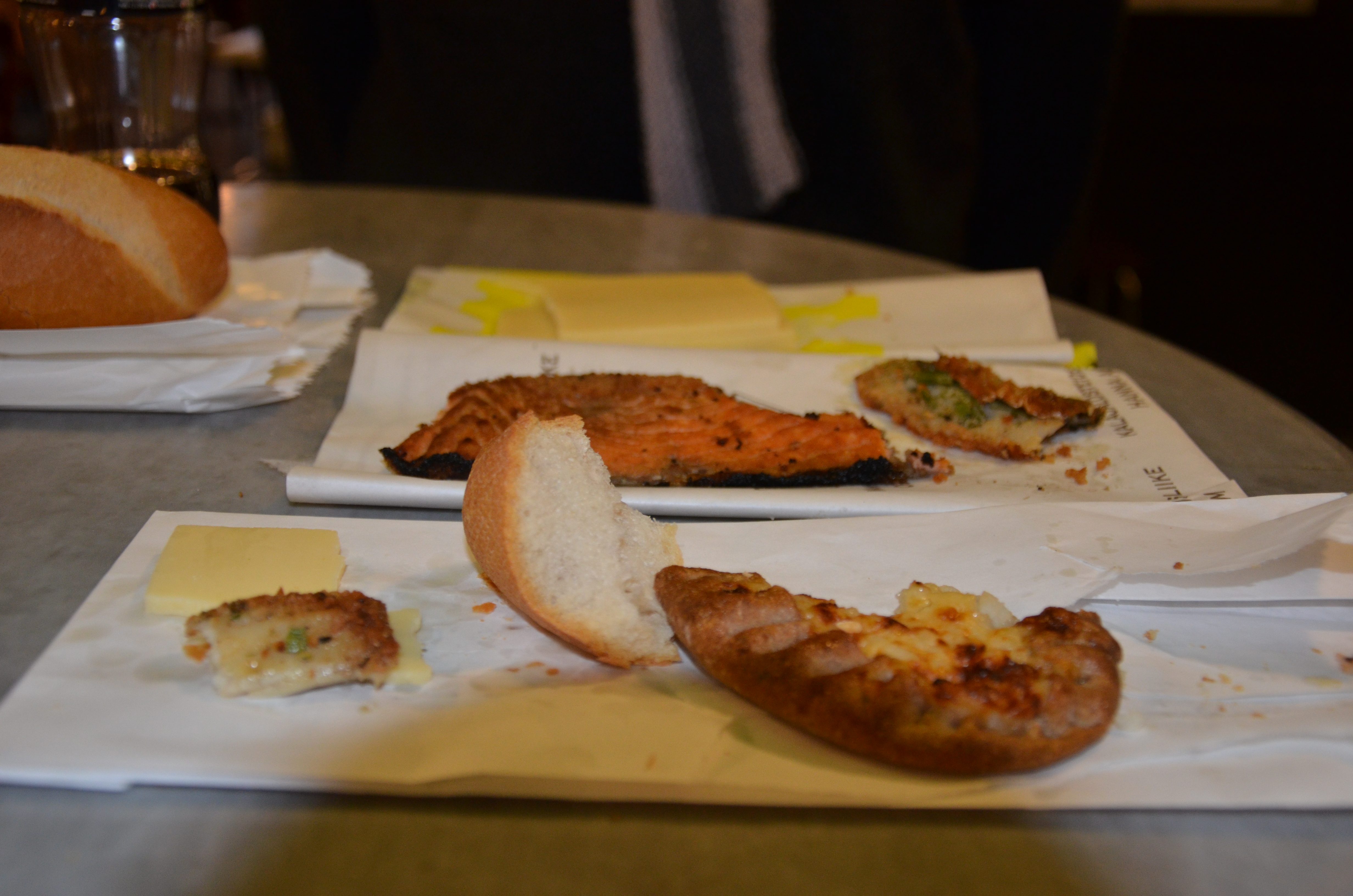 A Finnish breakfast - grilled salmon, fried herring, salty rice cake, cheese and fresh bread.