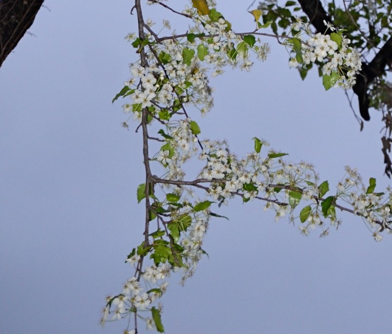 On the other hand, the signs of spring are peeking out. I took this picture of white blossoms daring to show themselves on the tree in my backyard. They even made it through a thunderstorm, gusty winds and a tornado watch.