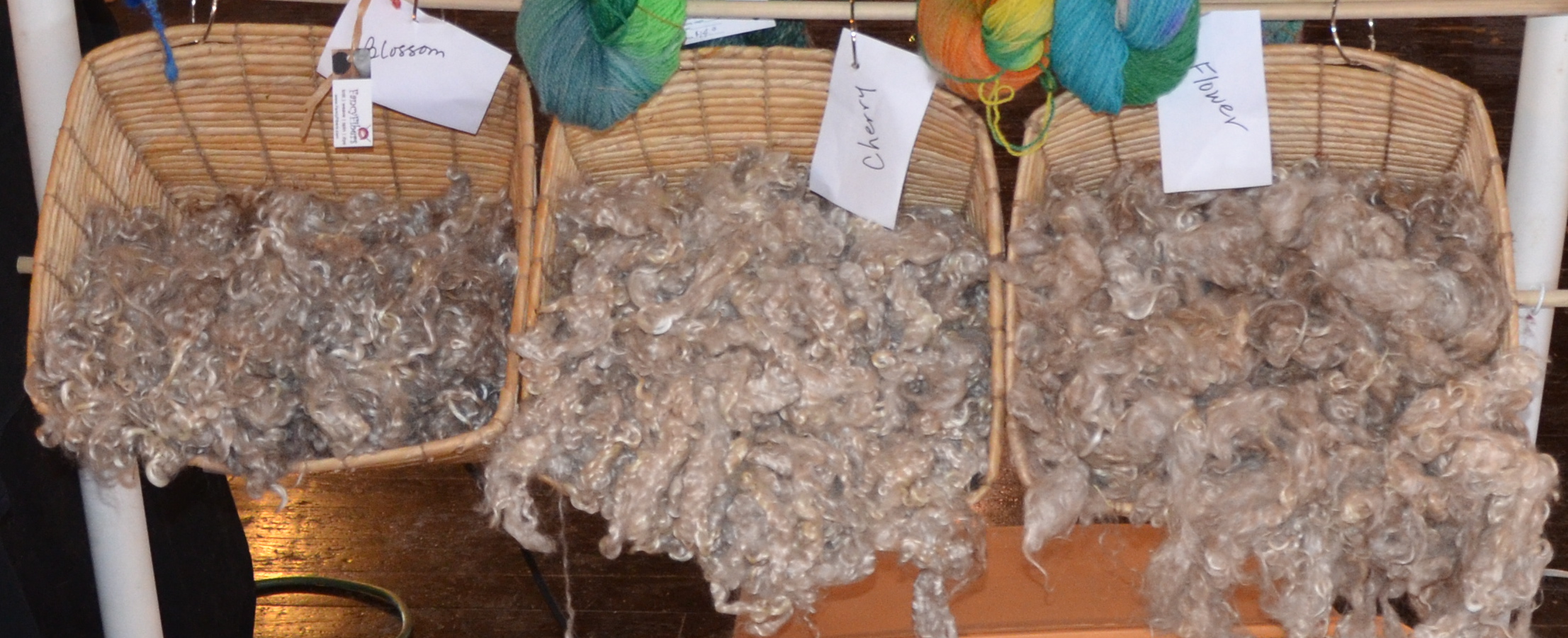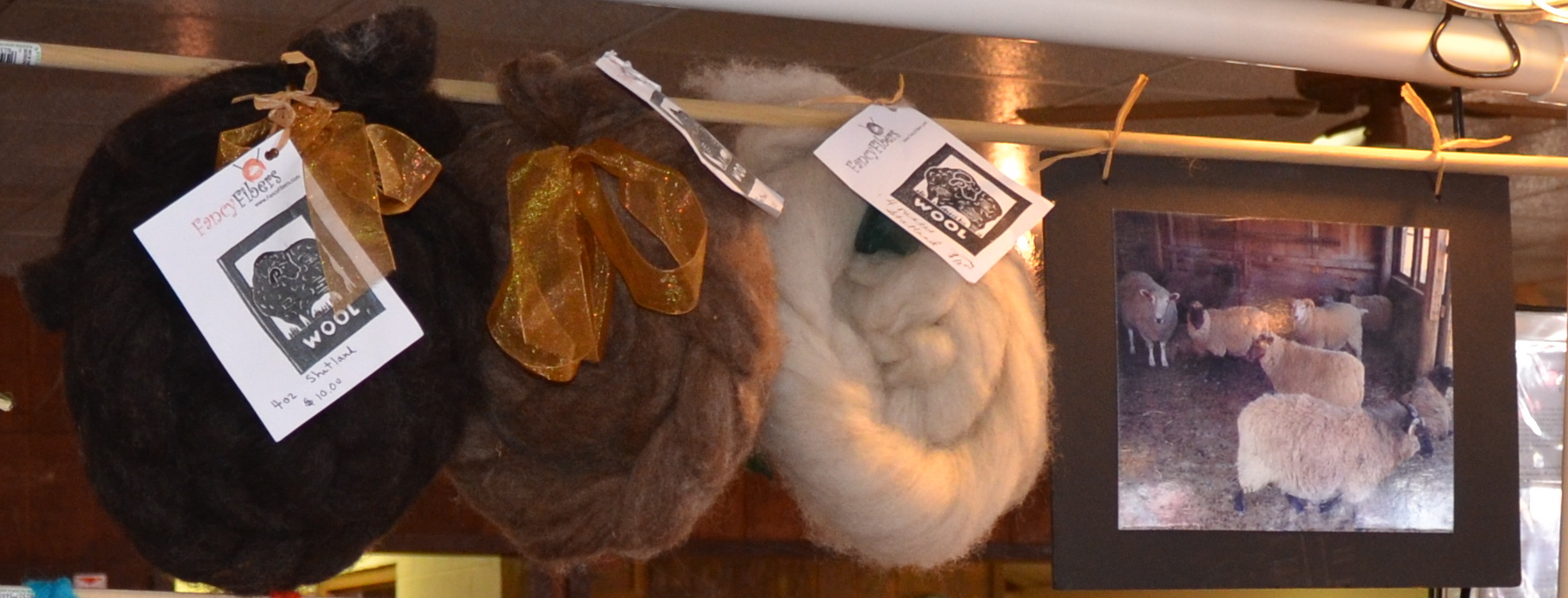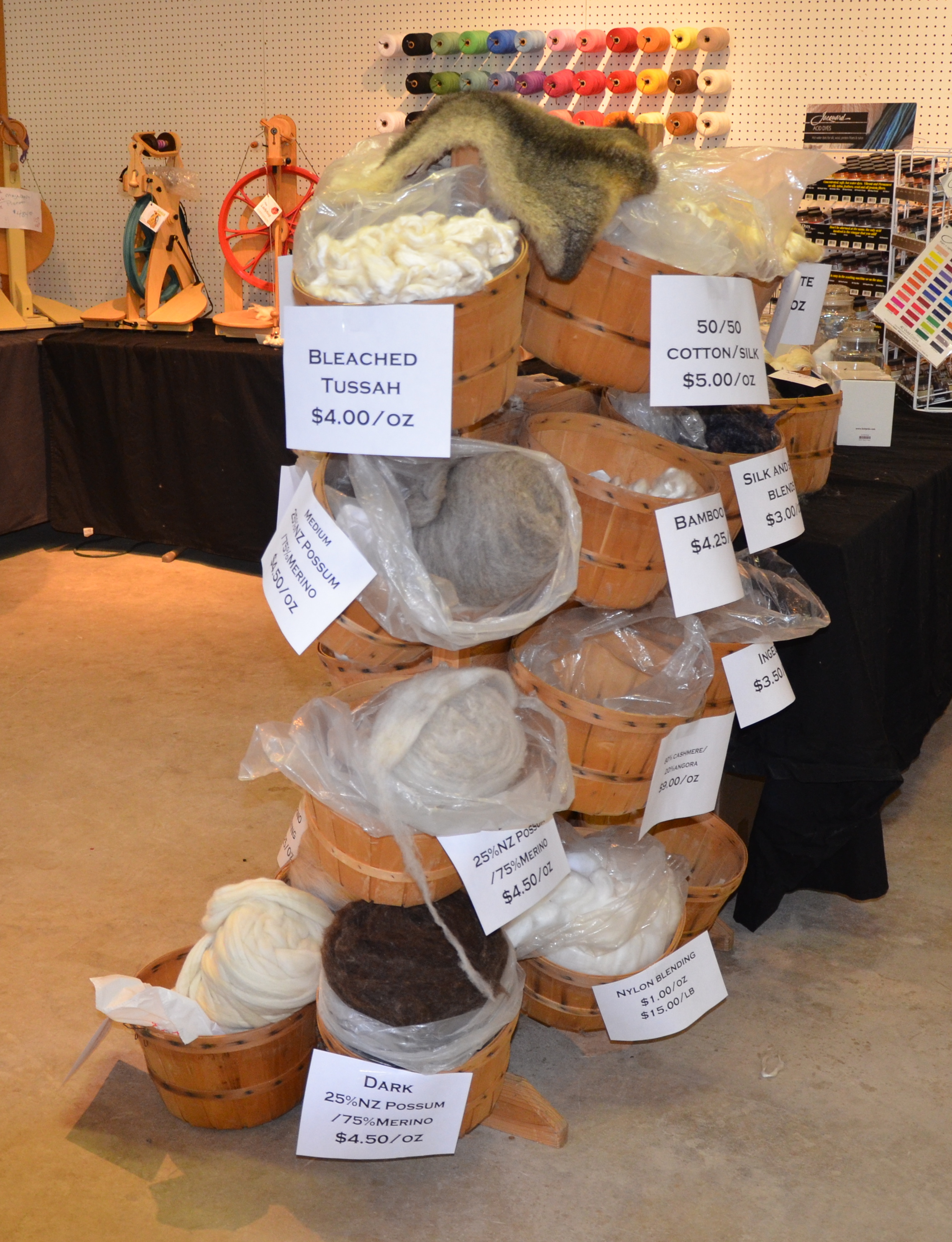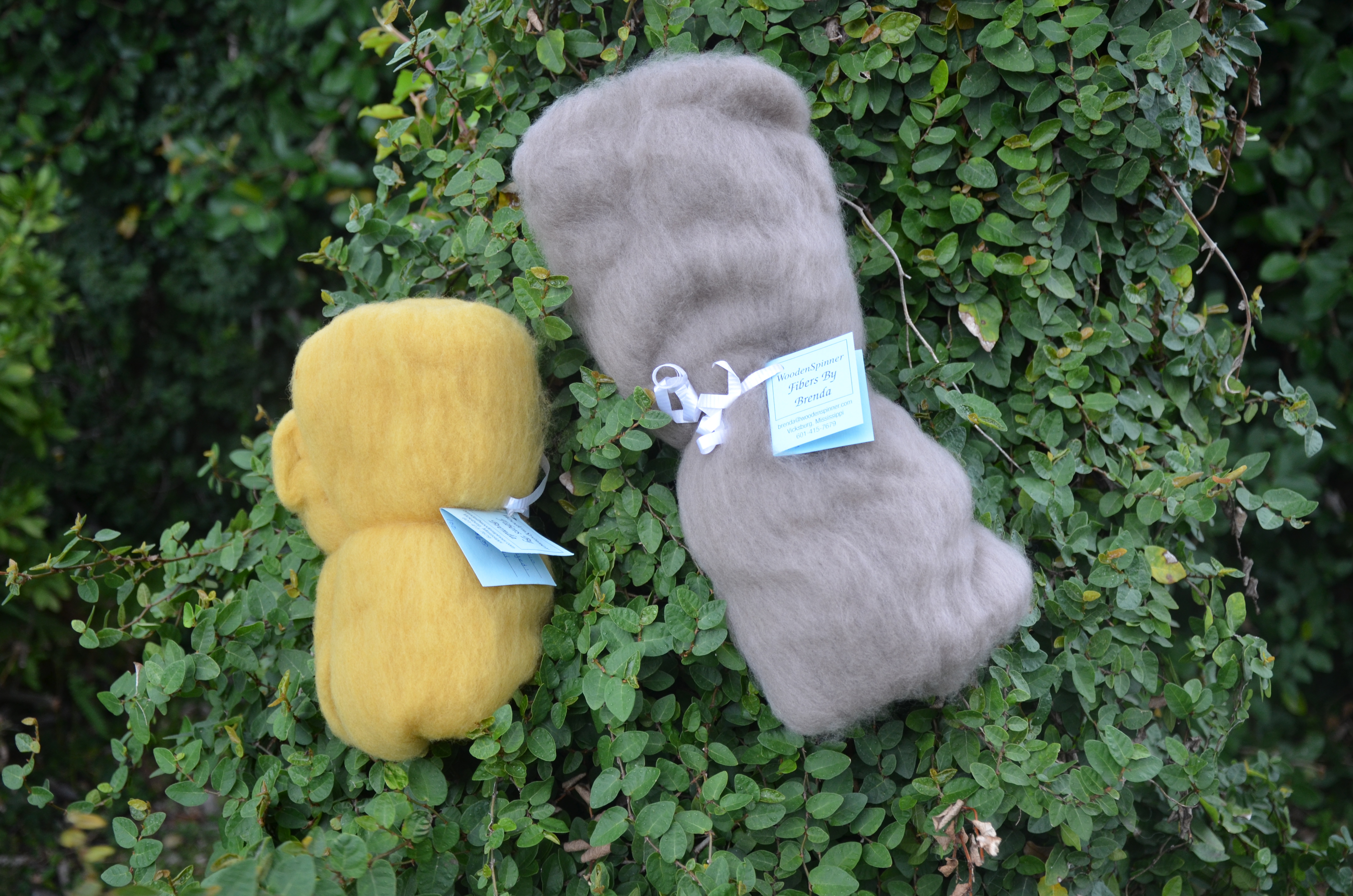 Besides the absolutely adorable animals, the highlight of the Kid’N Ewe Fiber Festival was the fibers! From raw fibers, natural and dyed, combed and carded, there were fibers aplenty. I started a very healthy fiber stash to complement my yarn stash. My first visit was with Mary Berry, proprietress of Fancy Fiber Farms. Mary runs a family farm with her husband where she raises her own animals. Her booth was interesting because it allowed you to see the fibers from their sources (she had pictures of her animals).