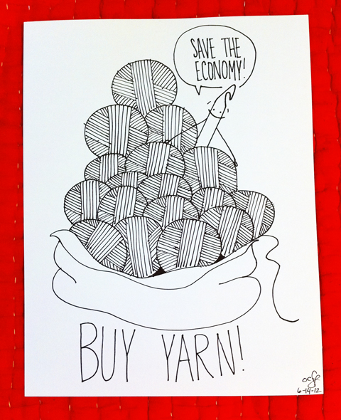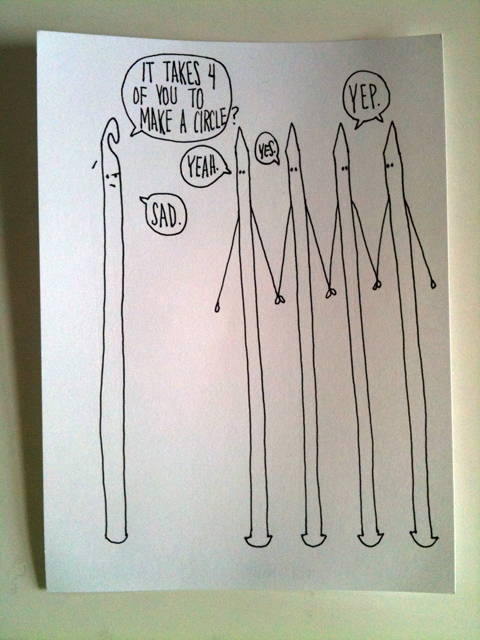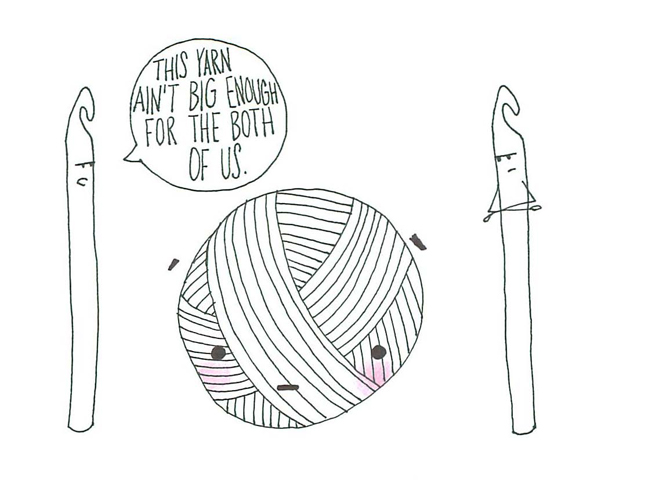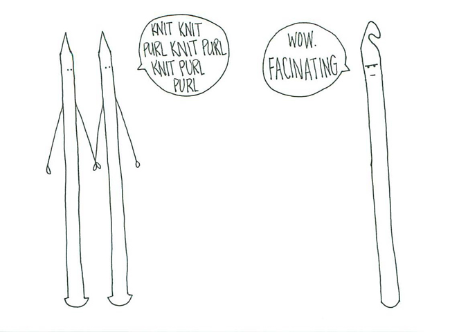 Even though I am mostly a knitter and only an occasional crocheter, I can’t help but crack a smile at her hook humor. Then I come to discover that she’s a fellow Texan! Go grab some more laughs at Obey Crochet. I will close with one more drawing that all hookers and sticksters can surely agree on.