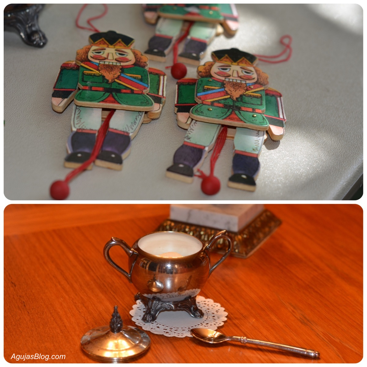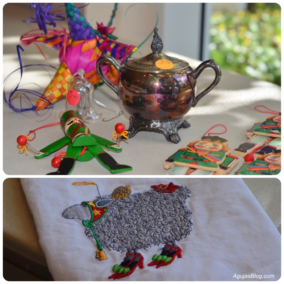 My favorite festival booth is Vintage Values. It’s basically a huge garage sale. You never know what treasures one will find. I found this cute little silver sugar bowl. Engraved on the bottom is a crown with the numbers 18 and 83 on each side. I looked it up and learned it was produced by the F.B. Rogers Silver Co. which was established in Massachusetts in 1883. I also picked up a $1 bag of wooden nutcracker Christmas ornaments and this little tea towel with a sheep decked out for the holidays.