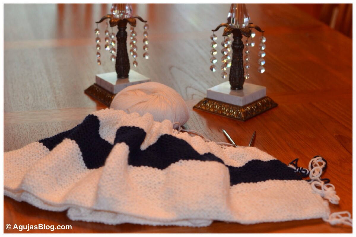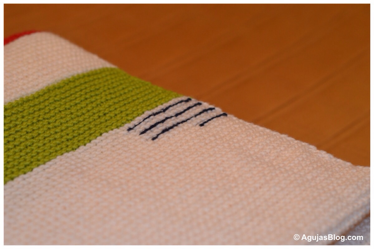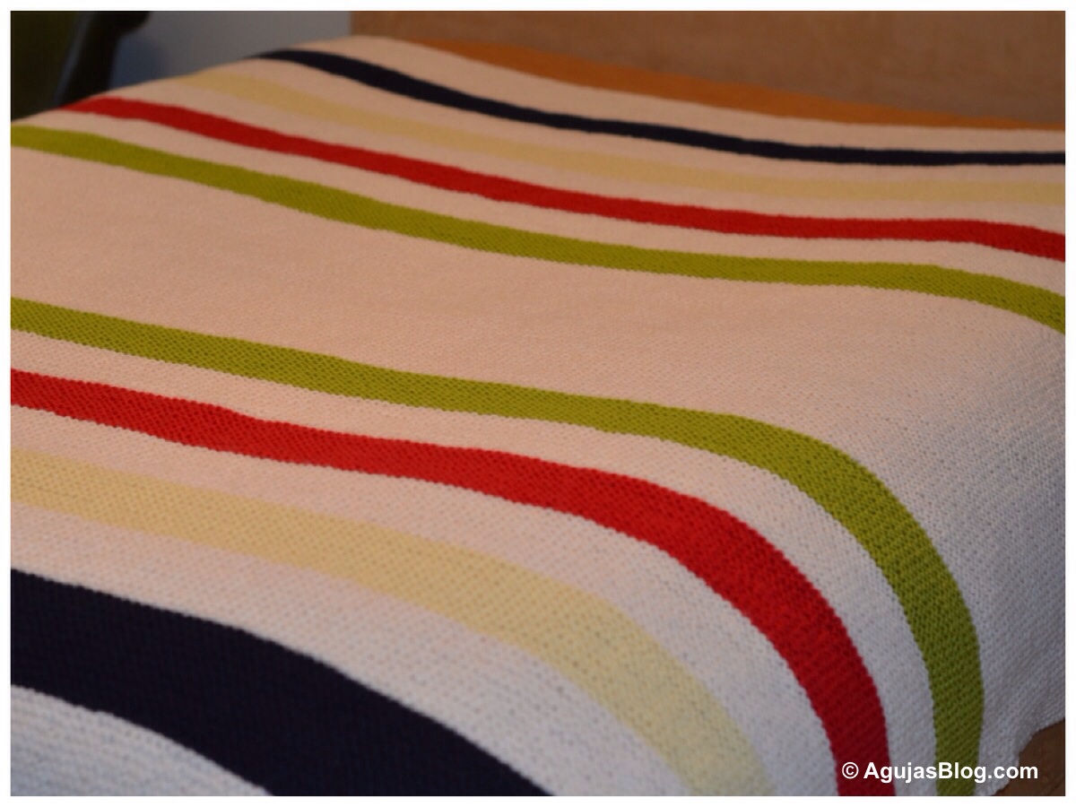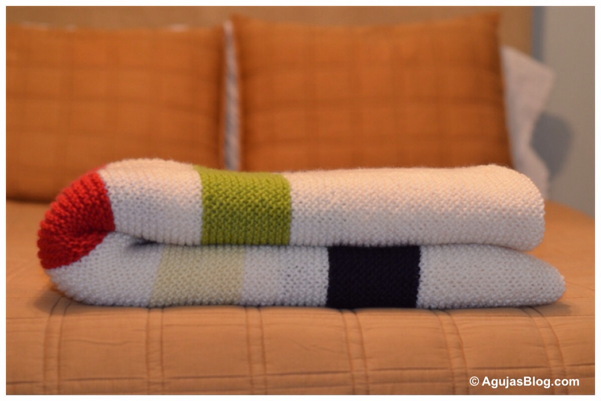 For the middle white section, make it as long as you like. Then repeat the above with the colors in reverse (green-white-red-white-yellow-white-navy-white). I would have preferred if the middle white section had been longer. If I were to knit this blanket again, I would probably knit more white rows in the middle and fewer white rows in between the colors. Hope this is clear!