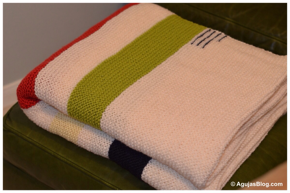It took a year to knit this blanket. The repetitive garter stitch produces a lovely texture but can be monotonous. Then there were the months abroad when the blanket lay dormant. Upon returning, I was determined to finish it by the holidays. The dimensions turned out at 72″ x 68″ and fit nicely over a full size bed. Based on the standard sizes marketed by the Hudson’s Bay Company, it merited 3½ indigo markings to denote size and approximate weight.
