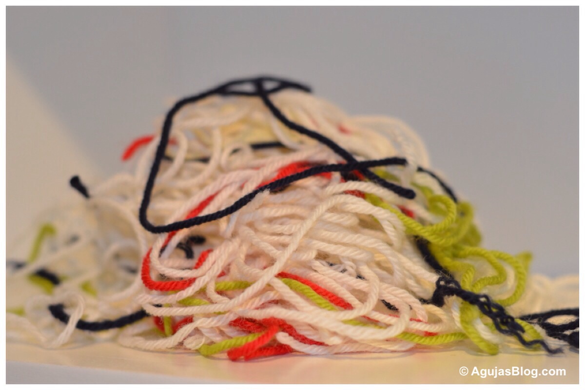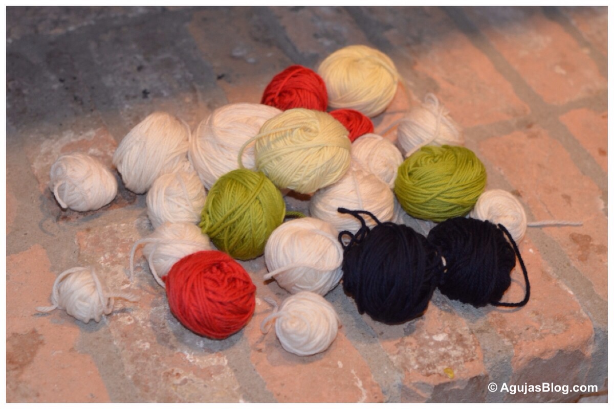 I chose 100% Superwash Wool for warmth and ease of cleaning. I found the elemental colors in Cascade Yarns. They did not have enough white so I found a comparable yarn from Ella Rae. I will note that the Ella Rae had an unusual number of knots. Often, I had to unravel a row to cut off the faulty piece and tie on a new string.