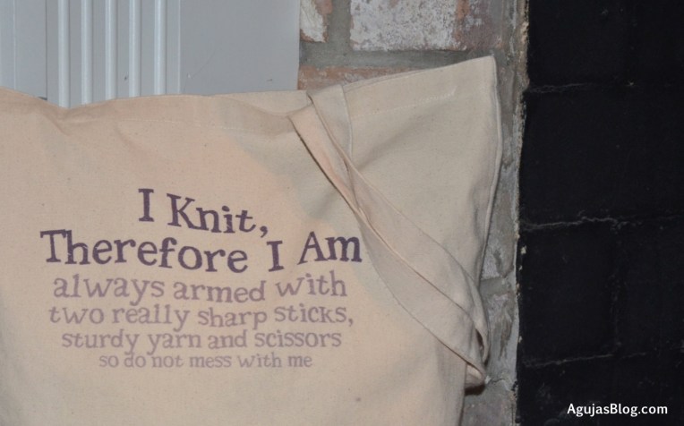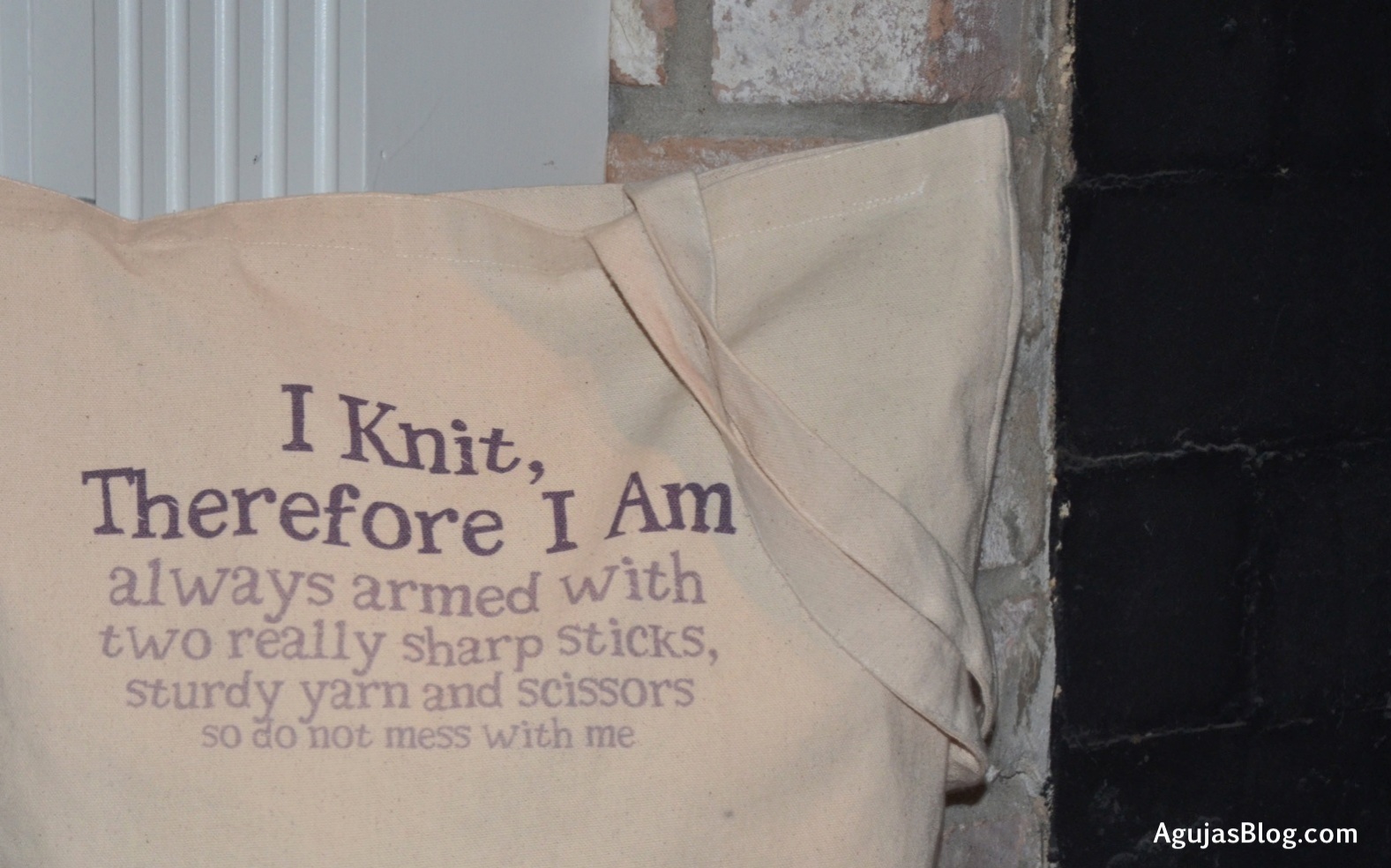 Like many knitters, I try to take a project along when I’m on the go. I sometimes tote my WIPs around in this bag by Crazy Aunt Purl available at CafePress. It’s roomy with long handles and it’s darn funny.