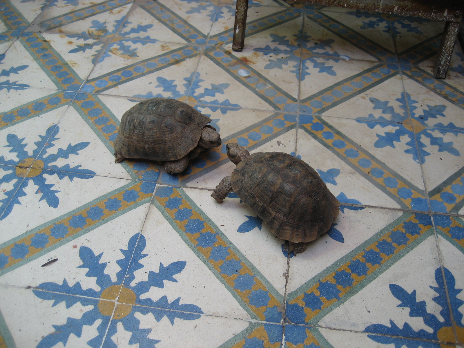 Fighting turtles. The first turtle sees the second one and starts walking toward it. The second one gets close enough to start snapping at the first. Must have been a domestic quarrel. After a while, both walk off together in the same direction.