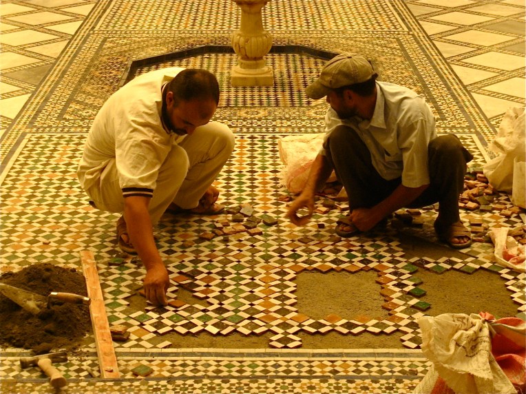 Workers restoring the tile work on the courtyard floor.