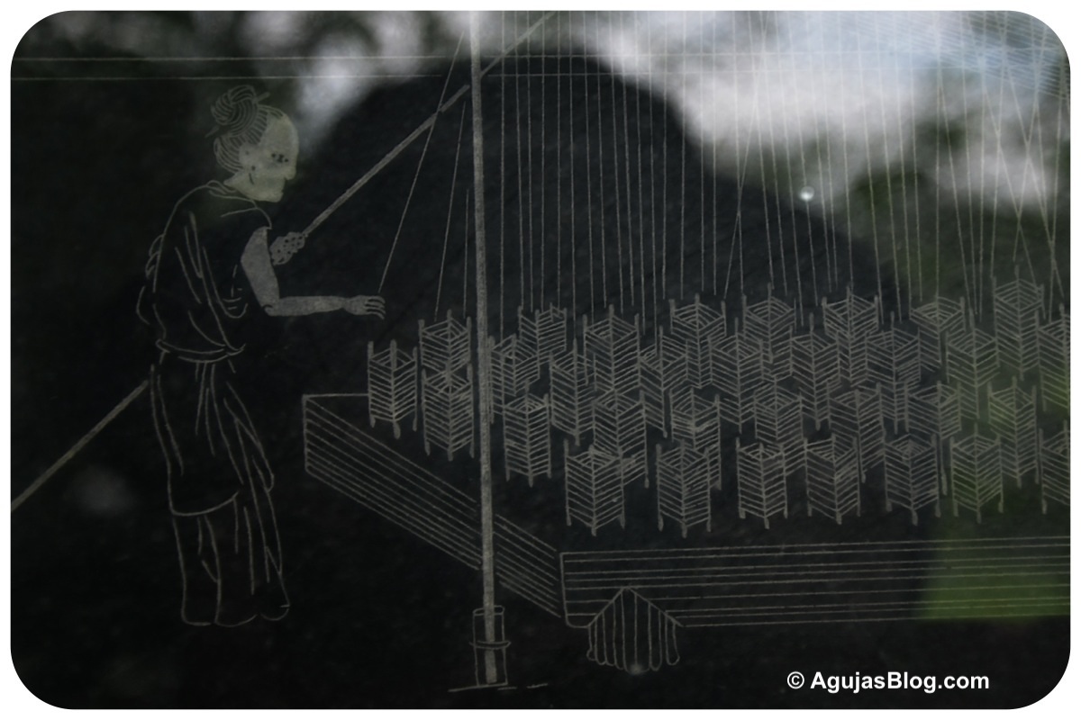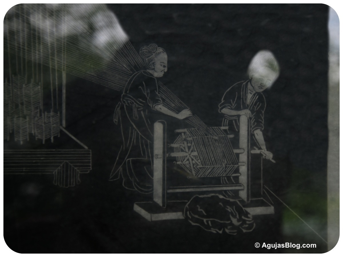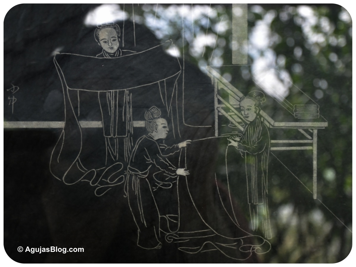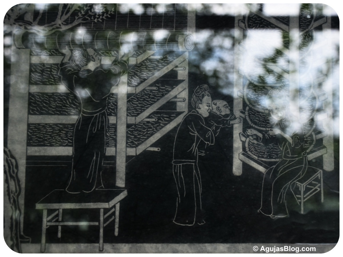 Along the corridor of the Studio of the Jade River (Yuhe Zhai), there was a series of stone carvings. According to the placard, the original scenes were painted on woven silk by the painter Cheng Qi during the Yuan Dynasty (mid-1700s). The scenes portray men farming and women weaving in ancient China. I selected the ones showing women’s work.
