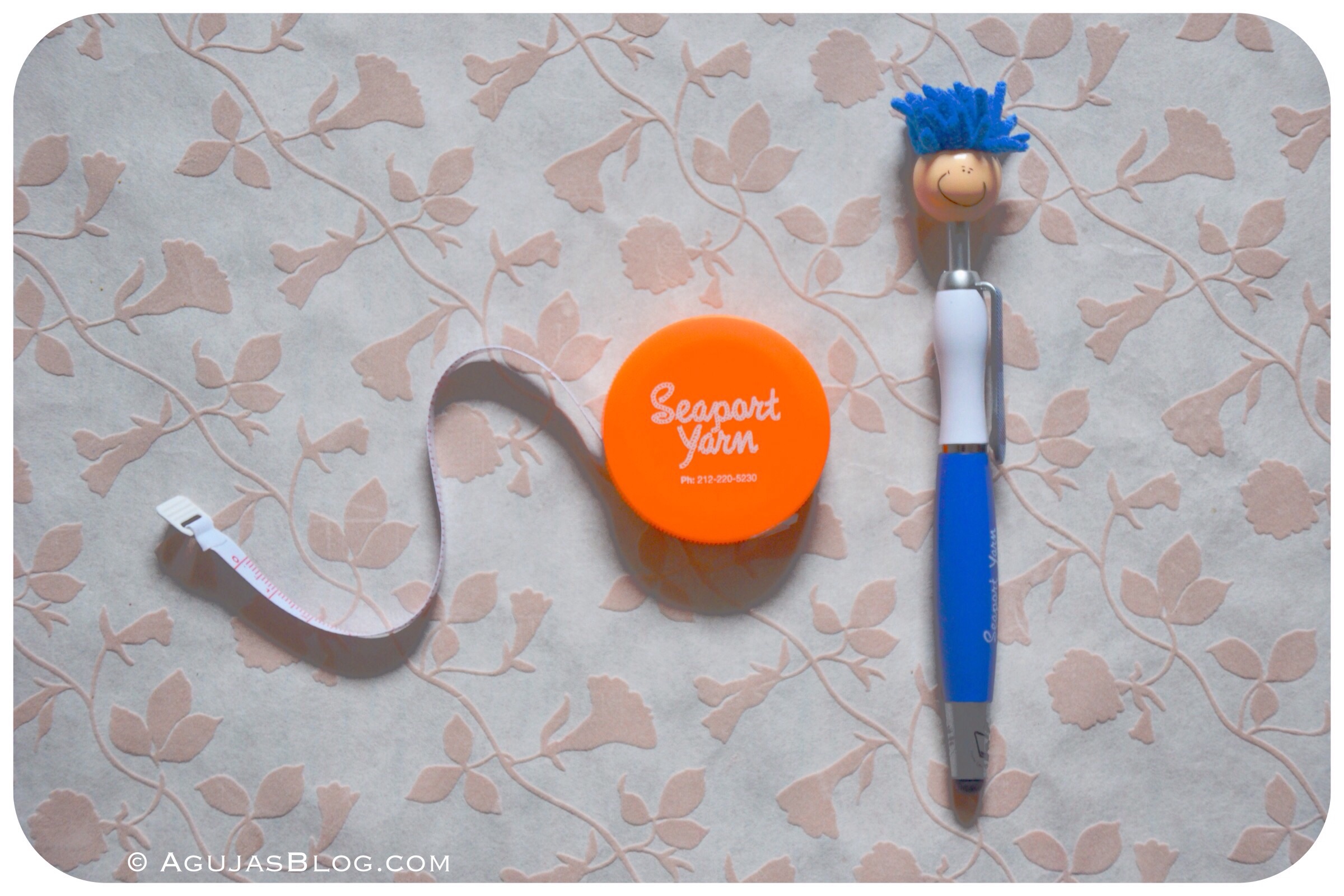 As I paid for my skeins, the proprietor threw in this handy measuring tape and fun pen. I think the funky hair is meant to dust small areas, like a keyboard. While I was happy with my purchases and the great customer service, I did find the store a bit messy. There wasn’t a clear surface anywhere and no place to sit (other than an old couch). It’s not the kind of yarn store where you can take your knitting and sit for a spell but it does have a good selection.