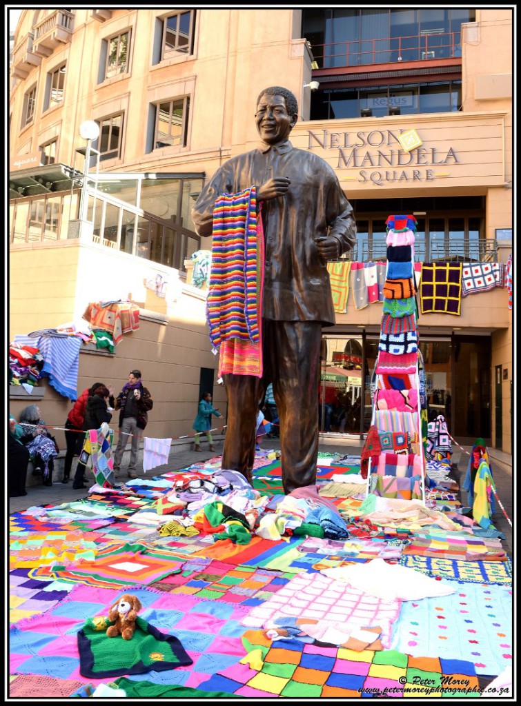 I was interested to learn about 67 Blankets for Mandela and looked them up online. It turns out that in April of this year, volunteer knitters, crocheters and quilters covered 3133 square meters with handmade blankets and broke a Guinness World Record for the largest area covered by a blanket. The meaning behind the number is a call to devote 67 minutes to community service in honor of Nelson Mandela’s 67 years of service to South Africa. (Source)
