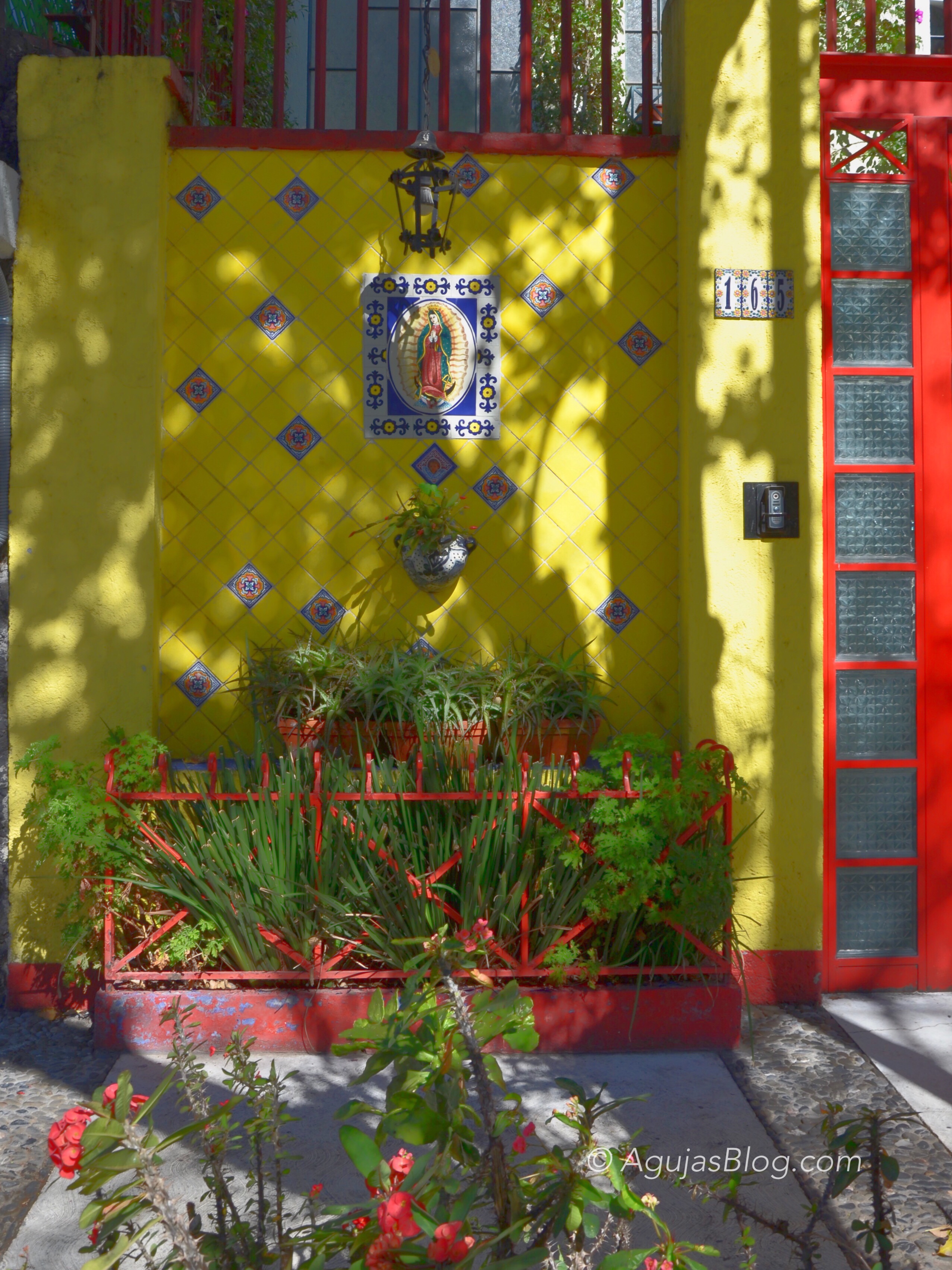Frida Kahlo’s blue house is located in the neighborhood of Coyoacán. The word means roughly “place of the coyotes” in náhuatl, an Aztec language still spoken today. The neighborhood is vibrant. Walking along the shady streets, we came across this brightly decorated altar to the Virgen de Guadalupe.